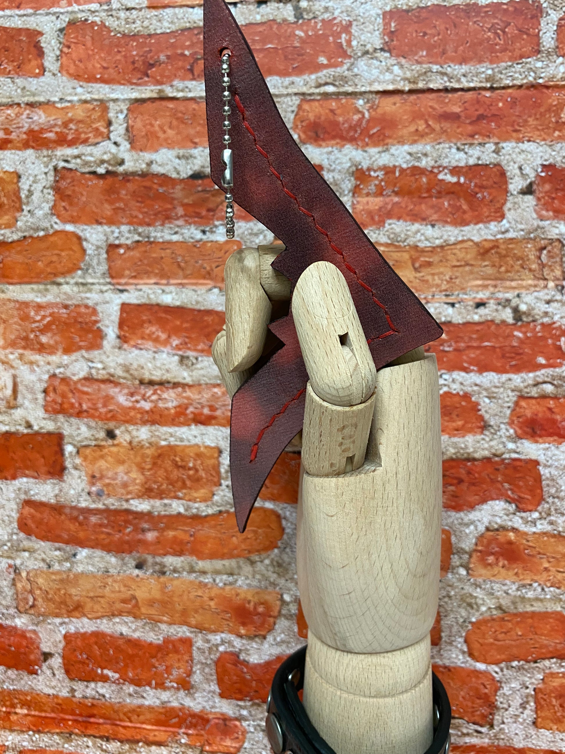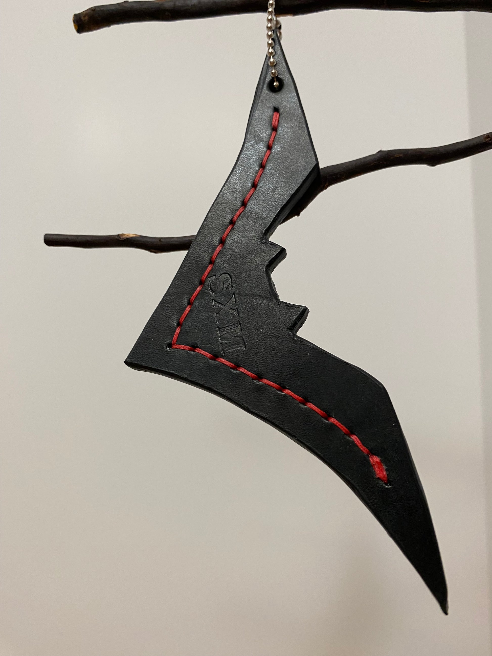 This is one boomerang you do not want to lose! The Bat Boomerang is hand crafted with black vegetable tanned leather and a very funky red/pink mixed chrometanned leather. Clip it to a bag or a keychain, just make sure you don't throw it.. It might not come back!