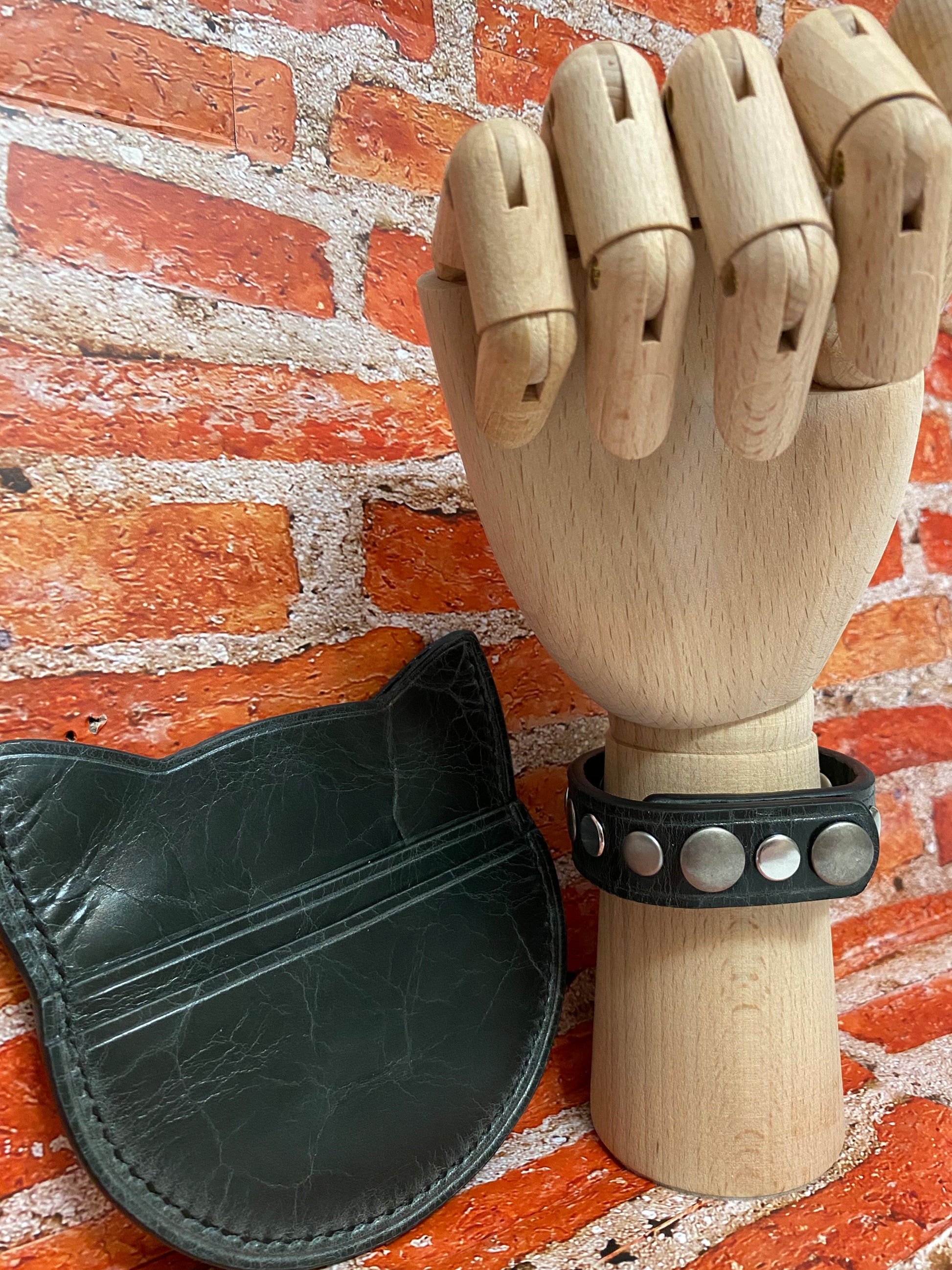 Bringing a little bit of luxury punk rock to your every day life. Hand crafted from black full grain leather, studded with two tone rivets and finished with black Italian edge paint. This bracelet has two buttons to size!